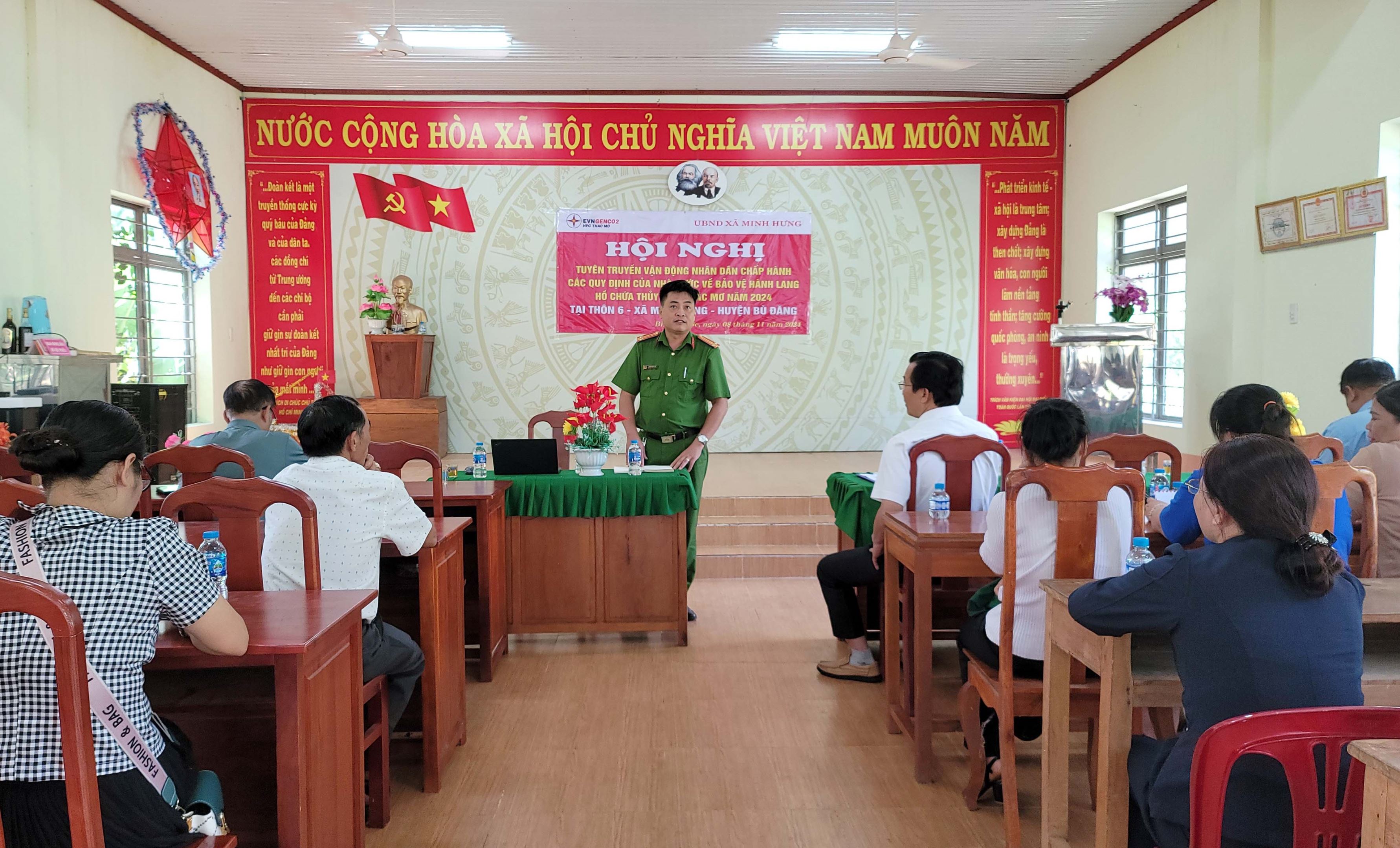Phát biểu tại hội nghị, đồng chí Phạm Đình Lâm – Trưởng Công an xã Minh Hưng phát biểu: “Thông qua tuyên truyền, bà con trong xã, thôn đã được trang bị thêm những kiến thức bổ ích, mỗi người hiểu rõ hơn nữa trách nhiệm của mình trong việc tuyên truyền, xử lý những hành vi vi phạm hành lang hồ chứa Thủy điện. Chính quyền xã yêu cầu các, thôn, các tổ chức chính trị - xã hội trong địa bàn xã tích cực triển khai đến các hộ dân để người dân có ý thức bảo vệ môi trường nguồn nước Thủy điện”./.