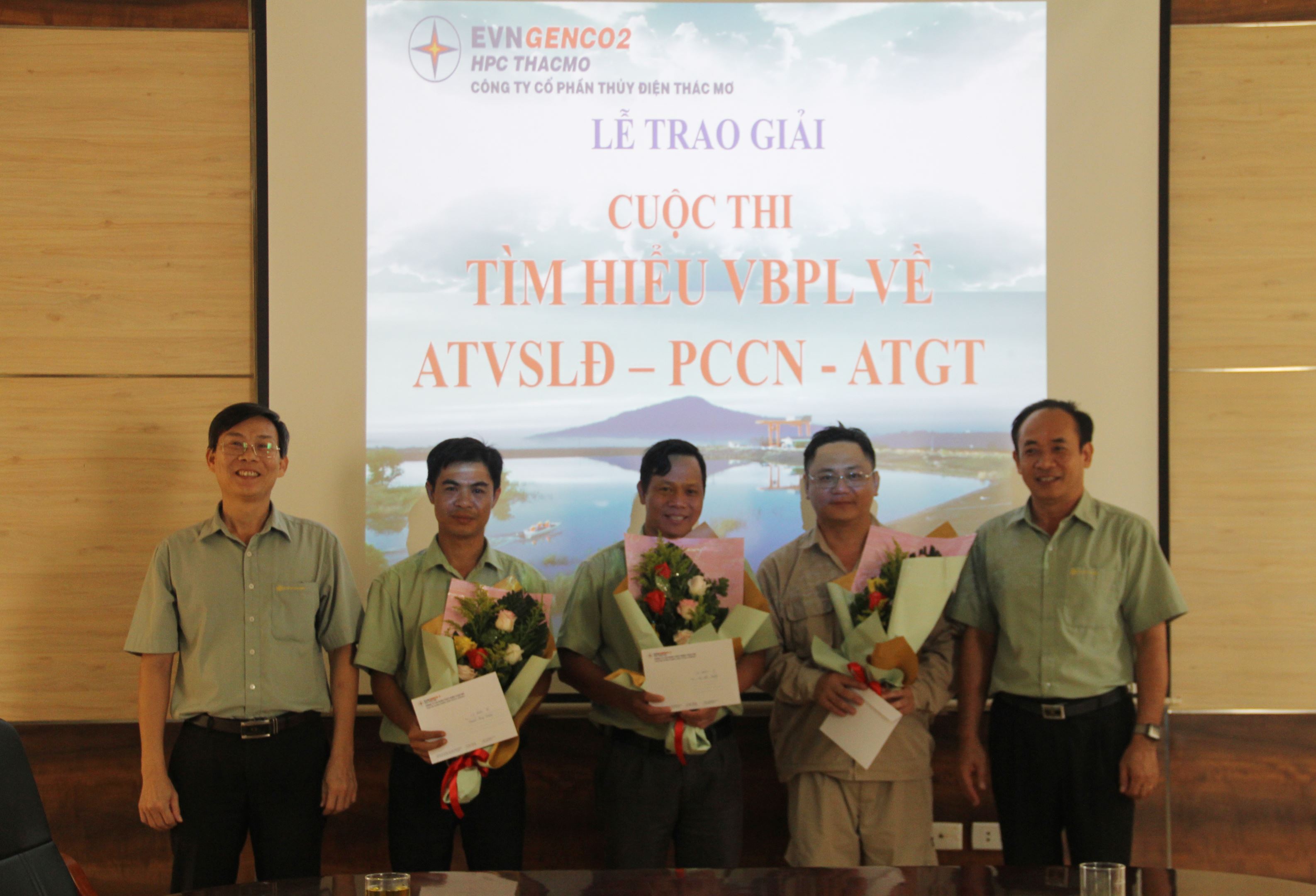 Phó Tổng giám đốc Nguyễn Hùng Lượng (ngoài cùng bên phải) và Chủ tịch Công đoàn Trần Ngọc Tân trao giải cho 03 cá nhân xuất sắc.