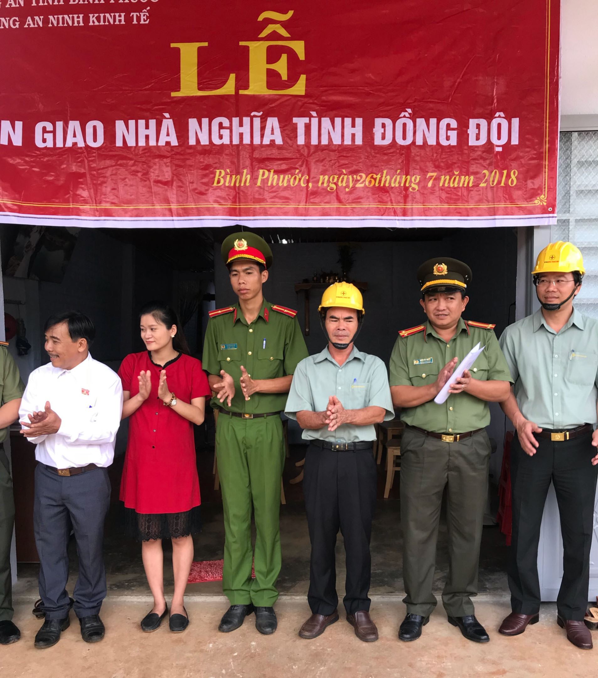 Ô.Phạm Như Nhật –P.Chánh Văn phòng Công ty và đ/c Nguyễn Chí Toàn Trưởng phòng An ninh Kinh tế CA tỉnh Bình Phước bàn giao nhà cho các gia đình chiến sĩ